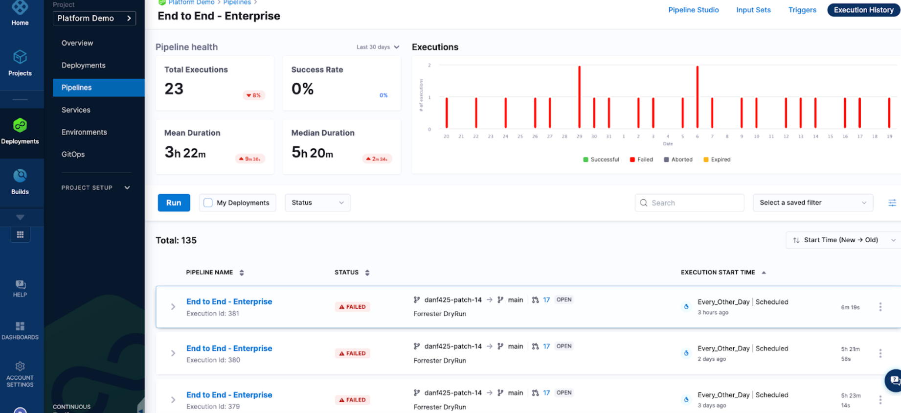 As you design your pipeline, you need to understand how often a pipeline is failing. You can look at your pipeline execution history to see pipeline failure rate. You might need to add/remove steps to start seeing success.