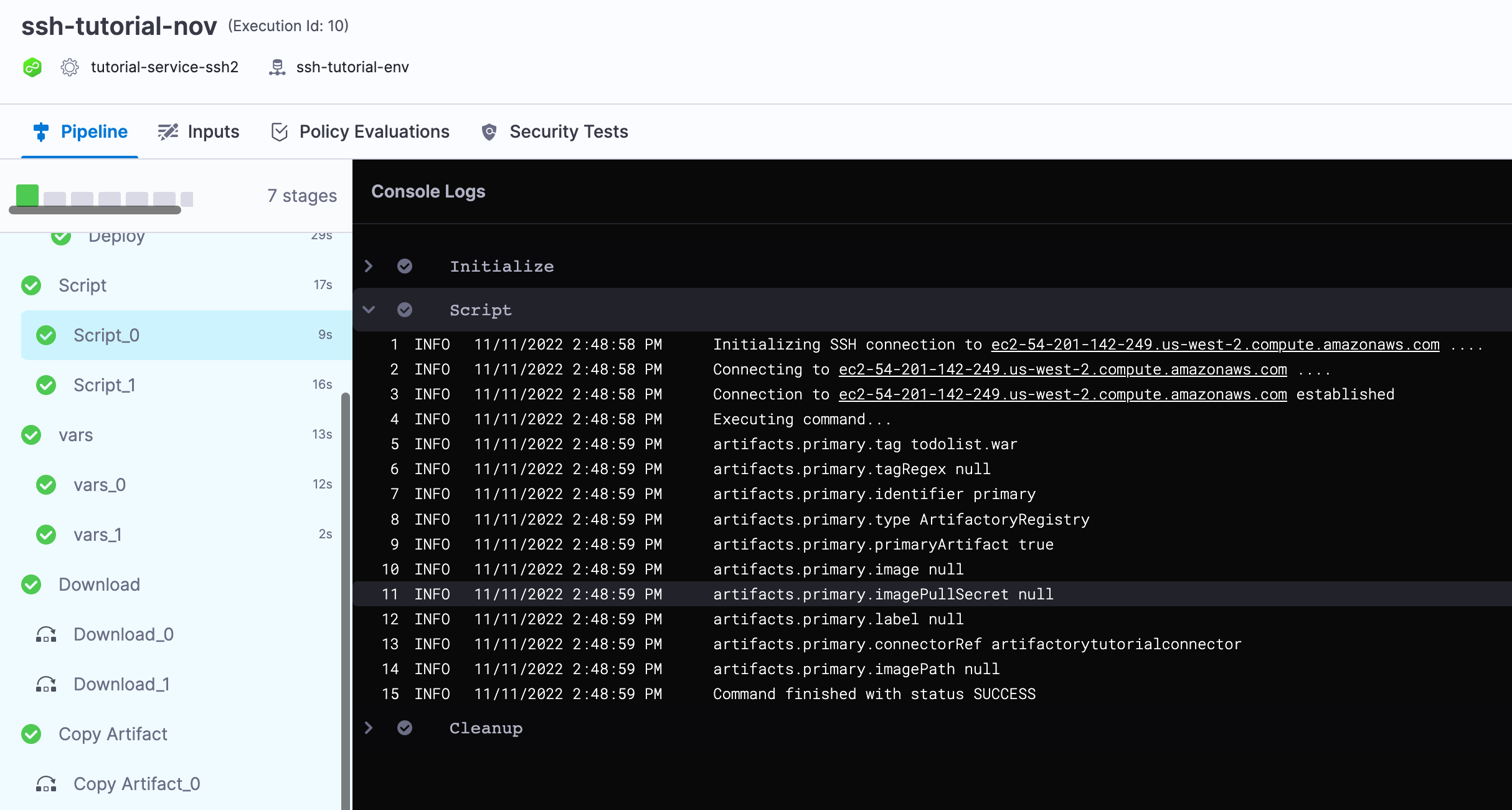For example, a destination path for a stage that deploys todolist.war using a service named tutorial-service-ssh2 to an environment named ssh-tutorial-env will look like this: