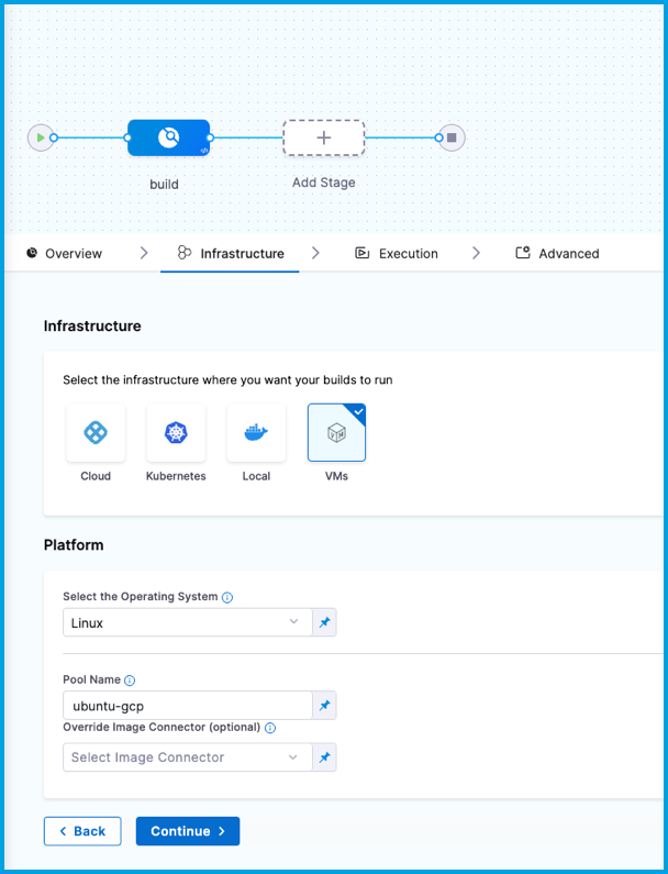 - In Harness, go to the CI pipeline that you want to use the GCP VM build infrastructure.